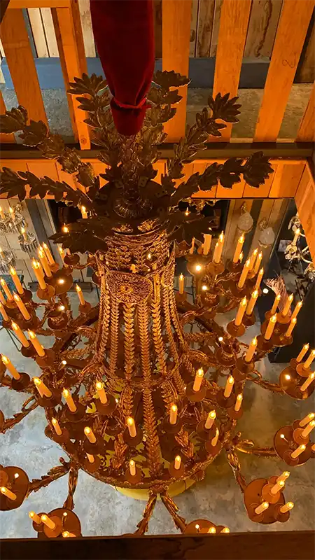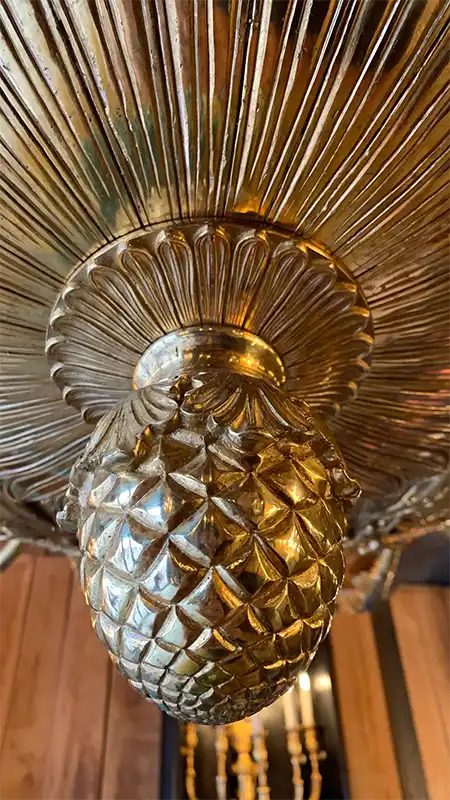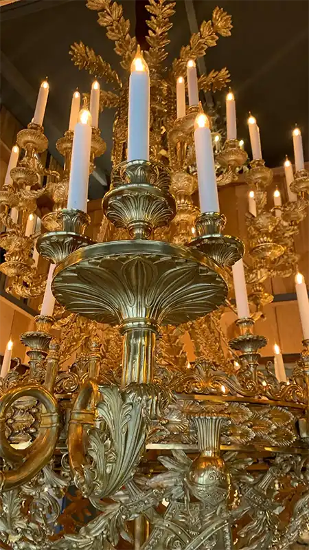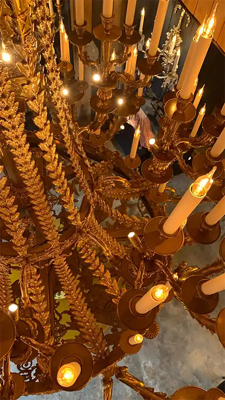 Each of the 112 lights is strategically positioned to ensure perfect balance and illumination. The detailing on every curve — oak leaves, garlands, serpentine arms — reflects the dedication and artistry synonymous with 19th-century palace commissions.