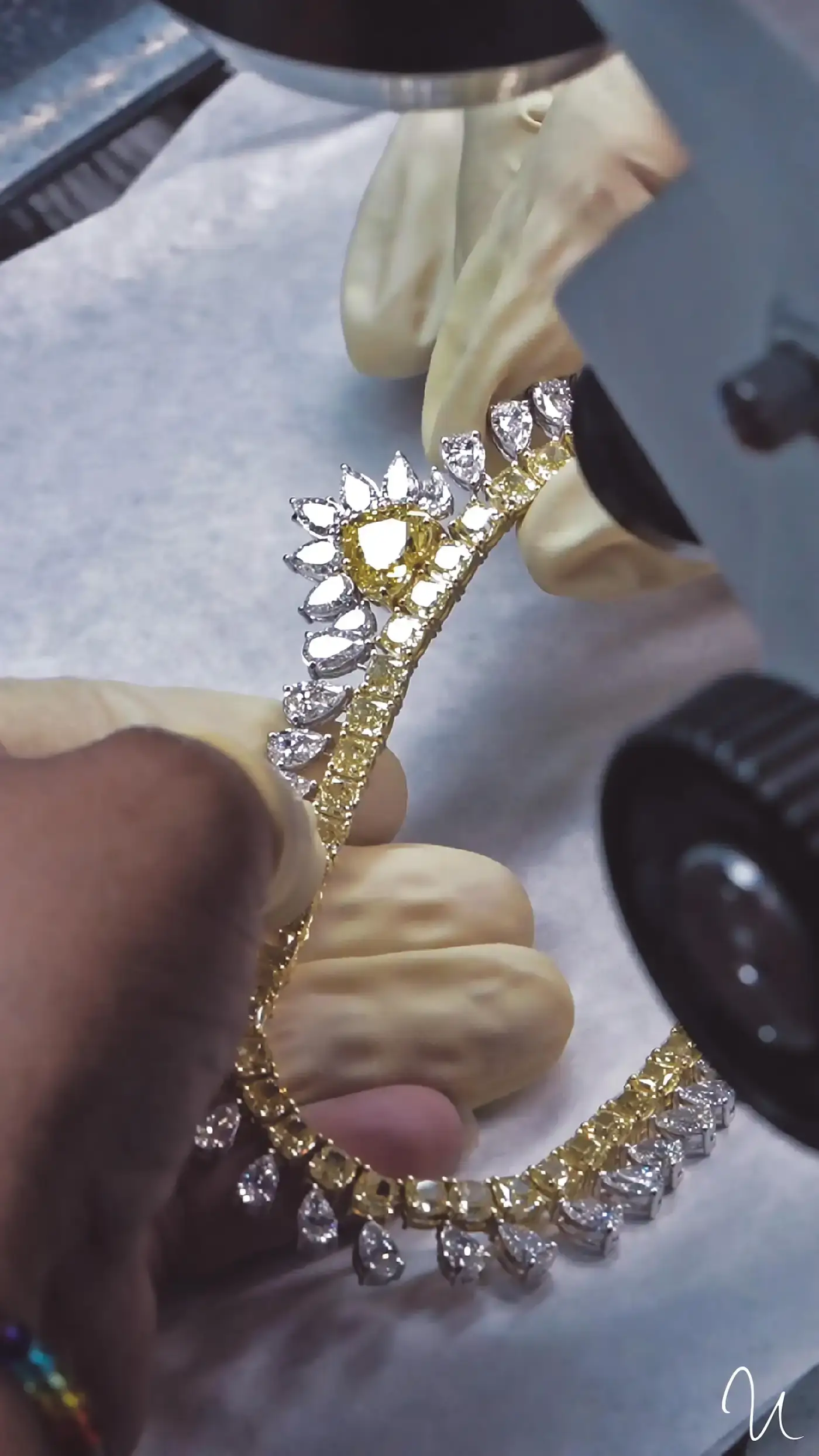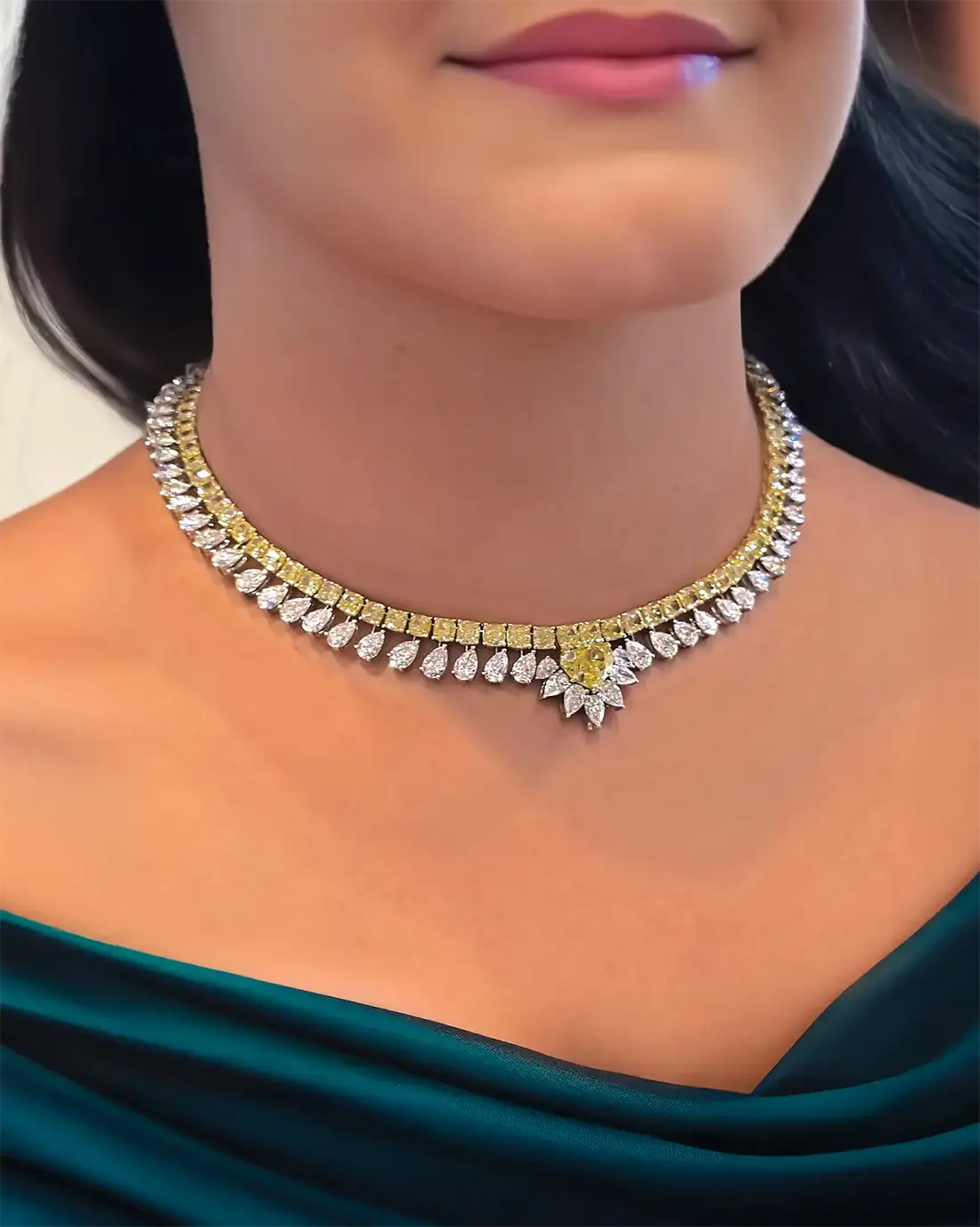 The 106 pear-shaped white diamonds totaling 46 carats provide a brilliant contrast, while the 88 fancy intense yellow cushion diamonds totaling 41 carats add warmth, depth, and luxury. Additionally, 25 fancy intense yellow round diamonds totaling 2.8 carats enhance the sparkle and brilliance of the design.
