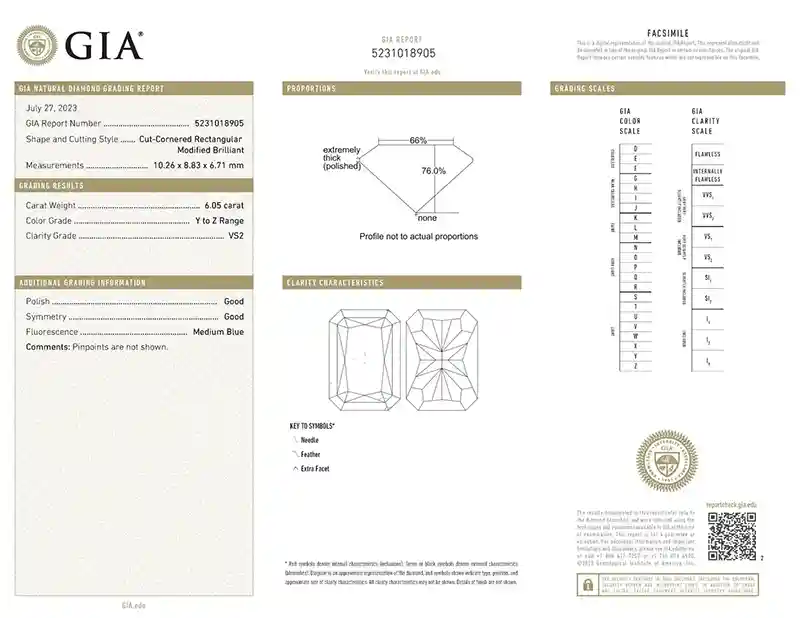 • Center Stone: 6.05 ct Radiant Cut Diamond, Y–Z Color, VS2 Clarity