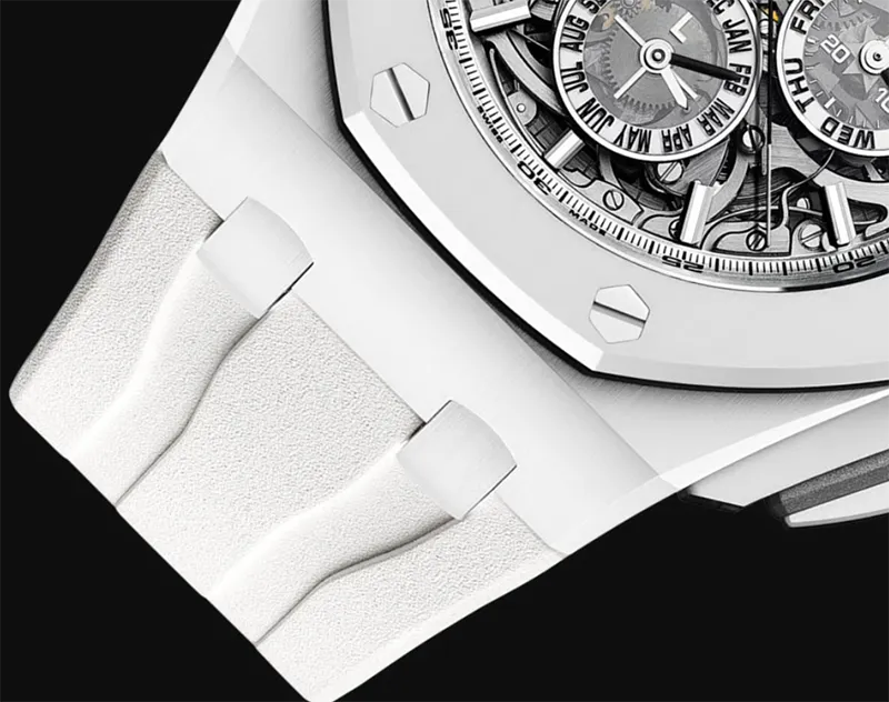 Paired with a white rubber strap, the watch balances elegance and sportiness. The strap is durable, comfortable, and perfectly complements the ceramic case while highlighting the Royal Oak Offshore’s modern design ethos.
