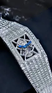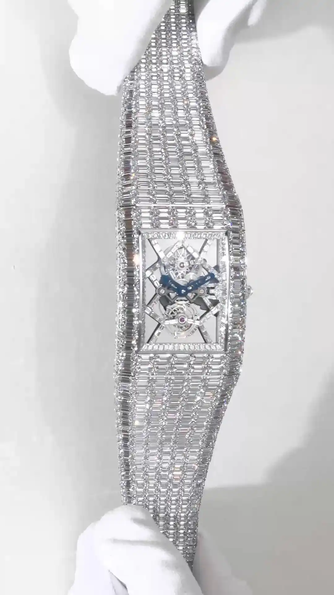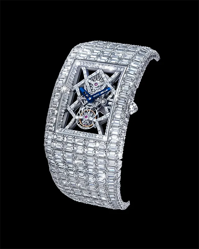 Movement Bridges: The technical marvel of the skeletonized movement is further enhanced with 57 baguette-cut white diamonds (~1.59 carats) set along the bridges. These diamonds draw attention to the mechanical artistry, transforming the movement itself into a kinetic jewel sculpture. With each flick of the wrist, the diamonds interact with light, producing a dynamic and hypnotic visual display.