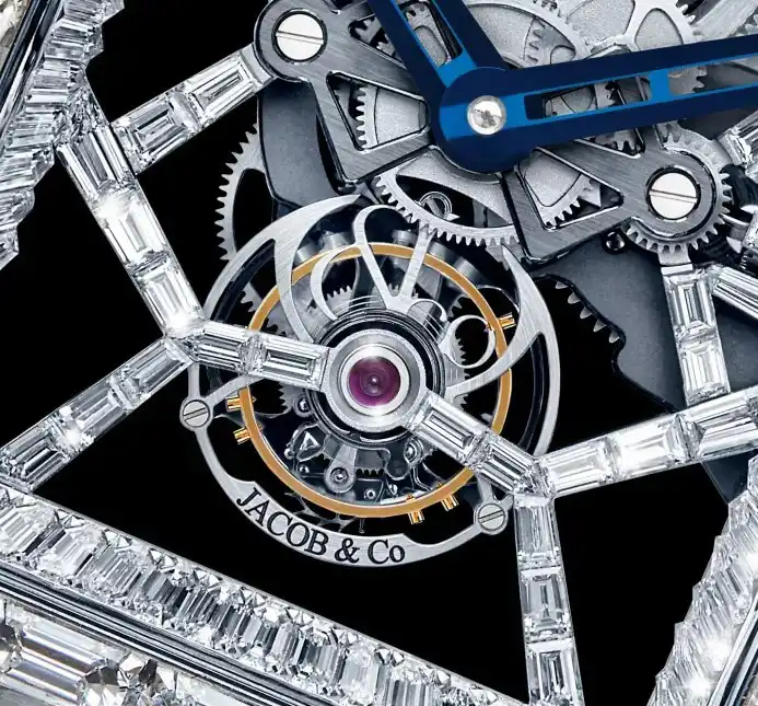 The movement is not only functional but also artistic, with bridges and plates adorned with diamonds and polished finishes. Every component demonstrates Jacob & Co.’s commitment to combining mechanical perfection with aesthetic grandeur, making it a delight for horology enthusiasts.