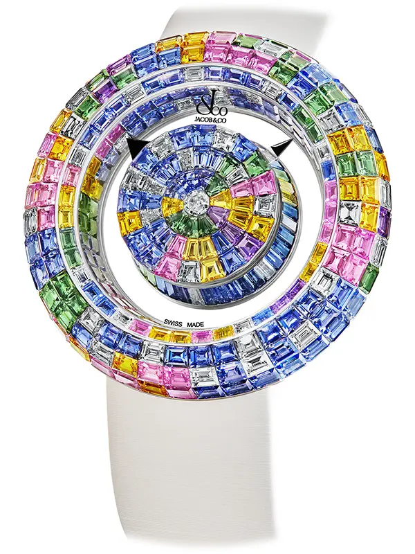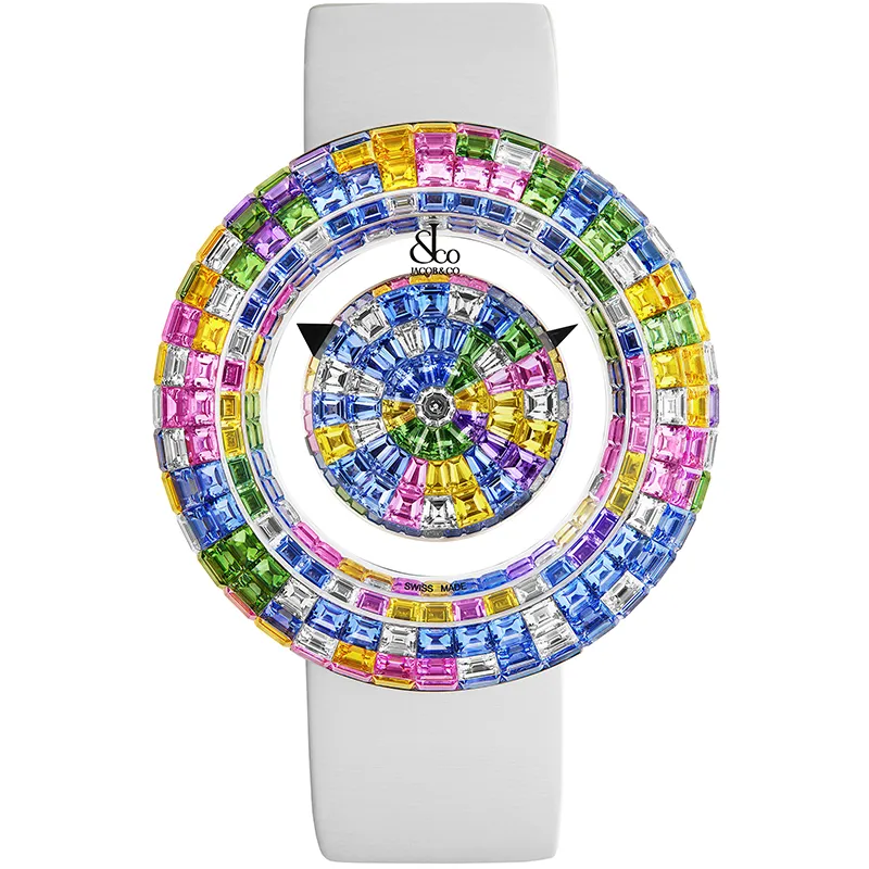 This visually striking complication requires extensive craftsmanship and precise engineering to achieve seamless motion and perfect readability from all angles. See the Brilliant Mystery Sapphires Rose Gold on Strap Jacob & Co.