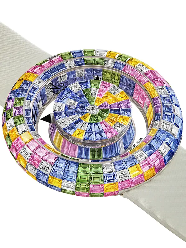 The result is a seamless display of color and brilliance across every visible surface of the watch, with no prongs or visible metal disrupting the gemstones’ continuous sparkle.