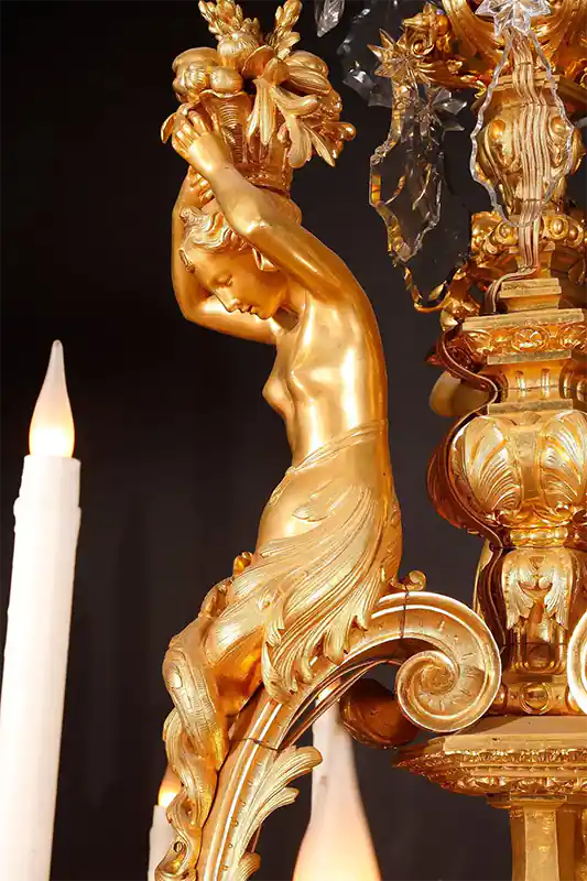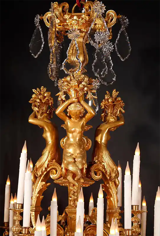 The upper section mirrors this sophistication with six sets of six light-arms, drawing the eye upward along the monumental central shaft decorated with foliate balusters and three female tritons holding baskets of exotic fruits, symbolizing abundance.