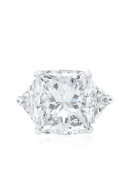 The ring embodies a perfect balance between classic elegance and contemporary luxury. Its sophisticated design allows it to stand out at formal events, gala occasions, or as a statement piece for everyday wear by collectors who appreciate the finer things in life. The combination of the radiant-cut center stone with two trillion-cut side diamonds demonstrates the designer’s deep understanding of proportion, symmetry, and gemstone harmony.