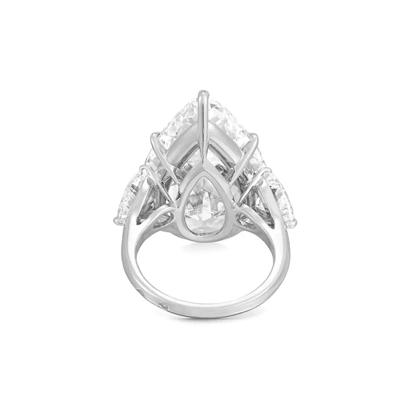 Set in a solid platinum band and flanked by two additional matched pear cut diamonds, this ring offers an architectural balance that enhances sparkle and symmetry while emphasizing the grandeur of the central diamond. The craftsmanship is exemplary, making this piece suitable for museum-level collections or elite jewelry portfolios.