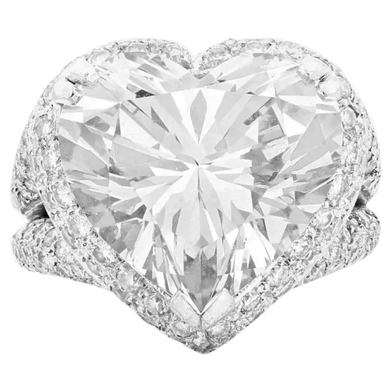 Platinum is the ideal choice for a ring of this magnitude. Its natural white luster amplifies the dazzling fire of the heart-shaped diamond while providing structural integrity to securely hold this remarkable 13-carat center stone.