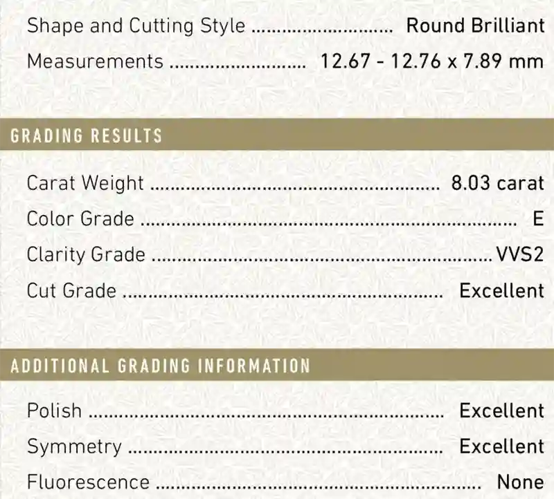 GIA Certified 8.00 Carat E/VVS2 Triple XXX Round Brillant Shape Diamond Ring – Technical Specifications