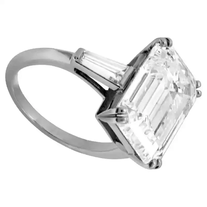 Highlight: Iconic 8.01 ct emerald cut diamond with VVS2 clarity in a luxurious platinum three-stone setting