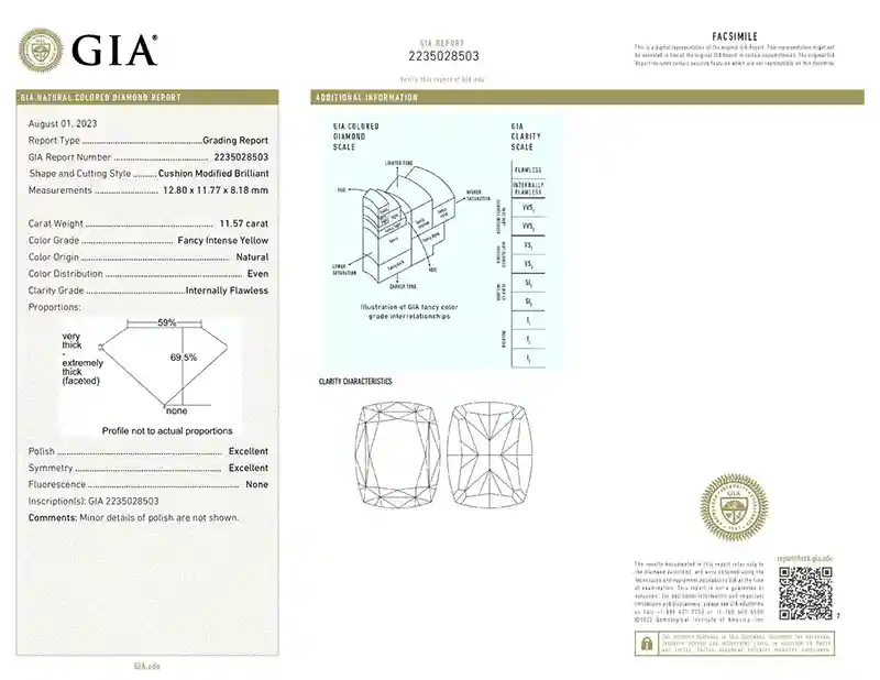 Every detail of the GIA Certified Cushion Cut IF Clarity Fancy Intense Yellow 11.57 Carat Diamond is backed by the Gemological Institute of America (GIA), the world’s foremost authority in diamond grading.