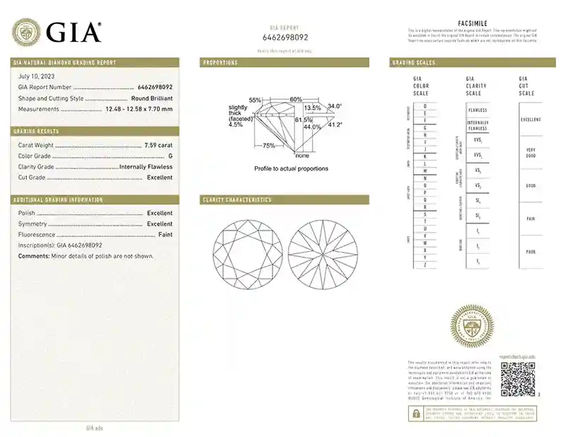 Technical Specifications – GIA Certified IF Clarity 7.59 Carat Round Brilliant Cut Diamond
