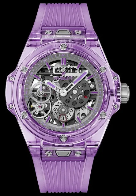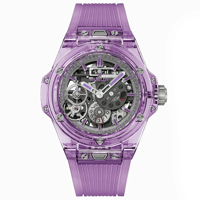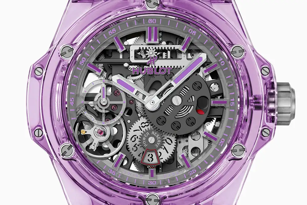 The transparent skeletonized dial exposes the complex mechanics beneath, complemented by violet components that echo the sapphire case. This openworked design is not just visually striking but also highlights Hublot’s engineering prowess.