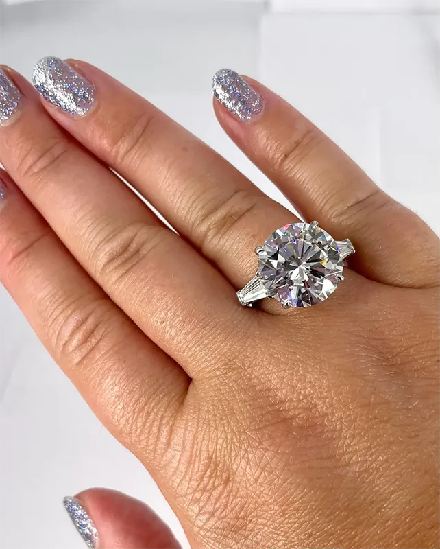 With its rare 9.43 carat GIA-certified round diamond of D color and VS1 clarity, complemented by tapered baguette side stones and a platinum setting designed for maximum brilliance, this ring stands as a testament to superior artistry and timeless elegance.