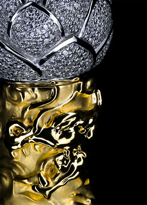 Every curve is hand-finished to mirror perfection. The combination of metals and gemstones creates a dazzling interplay of light and texture—gold gleaming with warmth, diamonds shimmering with icy fire.