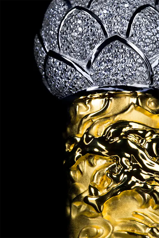 • The Lotus Flower, crafted in 18K white gold and encrusted with pavé diamonds, stands as a symbol of spiritual purity and rebirth, blooming in flawless perfection beneath the dragon’s strength.