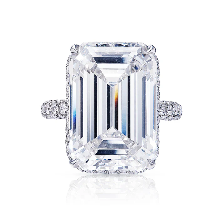 Its combination of a large, emerald-cut center diamond with sparkling accent stones ensures a dramatic yet refined look, perfect for engagement, black-tie events, or simply elevating everyday luxury.