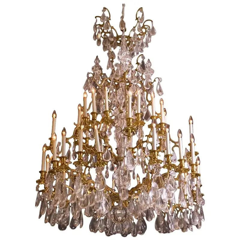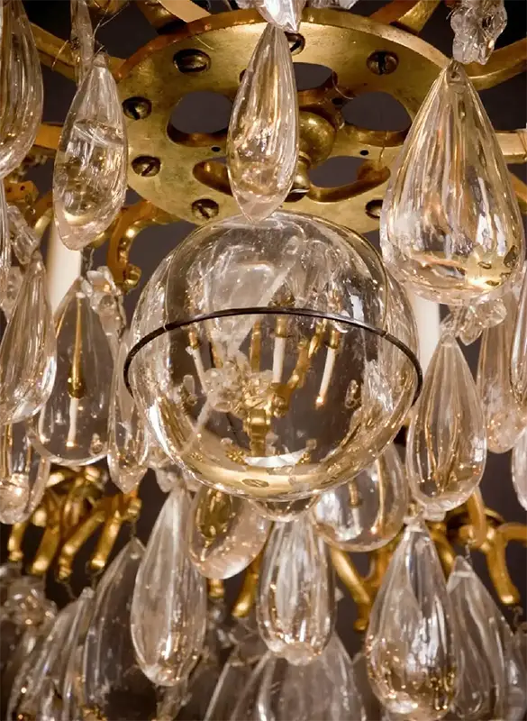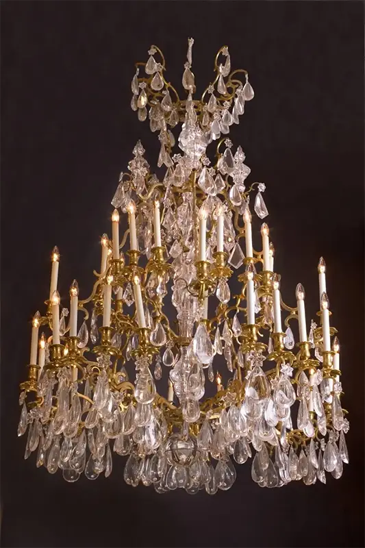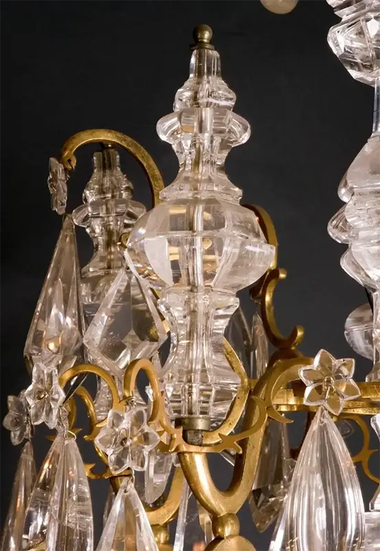 This chandelier is an investment in history, craftsmanship, and beauty. Its combination of bronze, gold plating, and exceptionally clear rock crystal ensures both aesthetic appeal and lasting value.