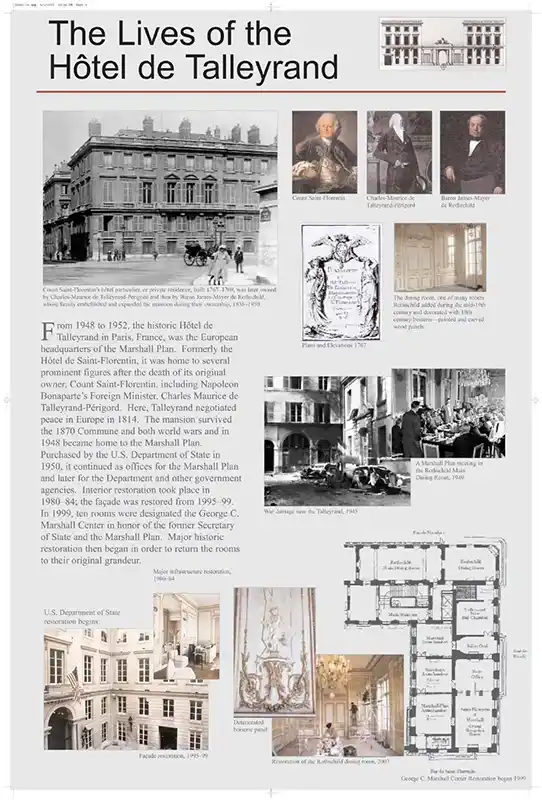 In 1947, the building was purchased by the U.S. Government to serve as the headquarters for the Marshall Plan, the historic program designed to restore Europe after World War II. From 1999 to 2006, the U.S. Government meticulously restored the building, carefully preserving original decorative elements, including this chandelier.