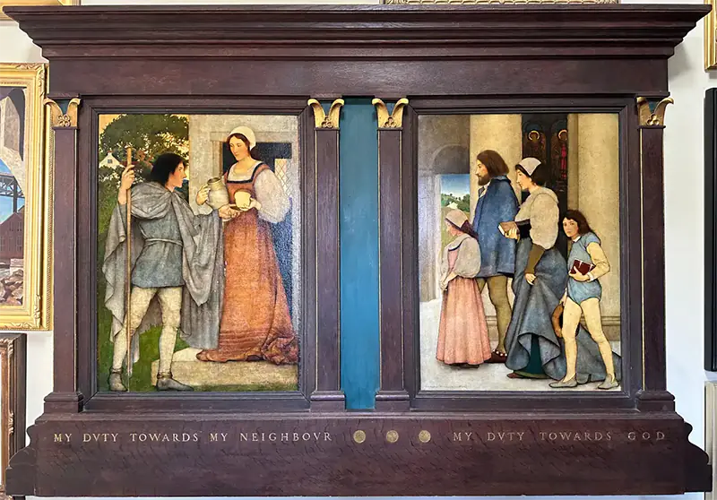 Created in 1898, the Maxfield Parrish My Duty Towards my Neighbor and My Duty Towards God diptych 1898 was commissioned for the Mrs. Parsons Chapel at Trinity Episcopal Church in Lenox, Massachusetts.