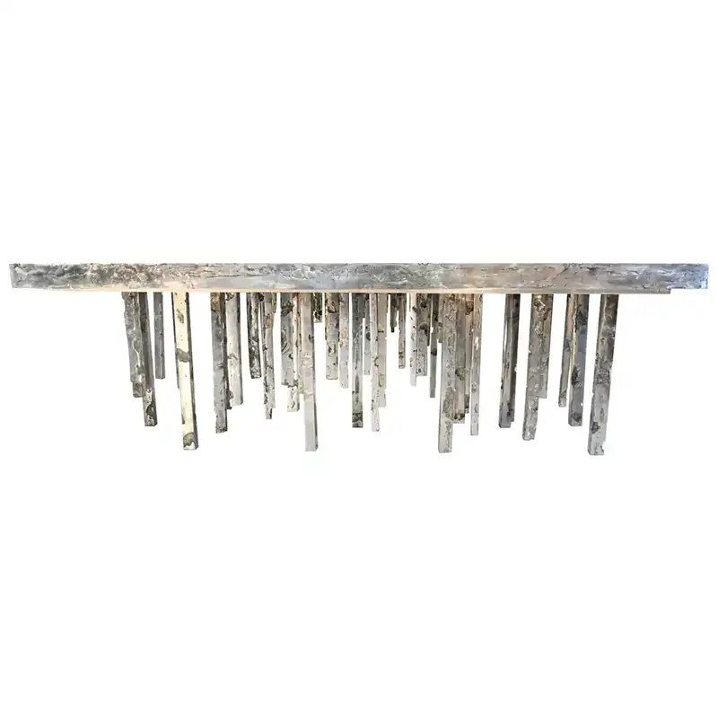 The One of a Kind Solid Zinc and Petrified Wood Waterfall Sculptural Dining Table is an architectural marvel. Featuring 48 sculptural zinc legs cascading like flowing water, the table earns its name from the dynamic “waterfall” effect.