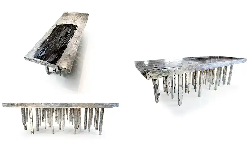 At the heart of the One of a Kind Solid Zinc and Petrified Wood Waterfall Sculptural Dining Table lies John Brevard’s “Decay of Time” philosophy. This series is dedicated to the transformation of natural elements through millennia, reflecting both the impermanence and endurance of life.