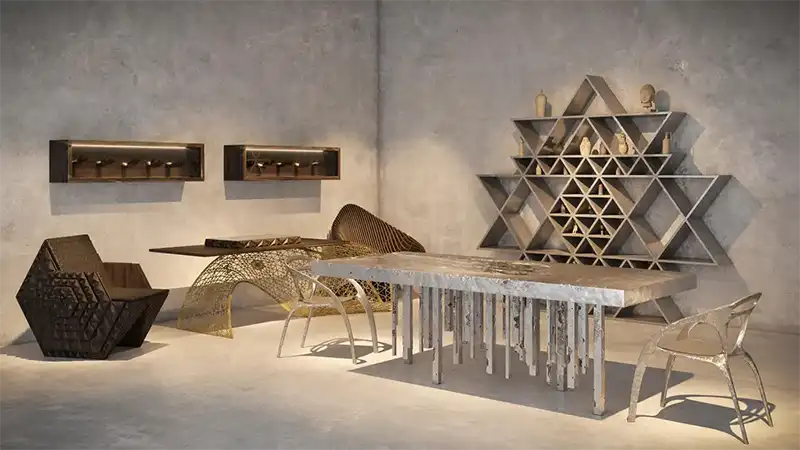 His work consistently draws on fractals, universal geometry, and the rhythms of nature, producing objects that resonate on both physical and metaphysical levels. see the Silver Gilt Exhibition Tea Table By Maison Aucoc 1904