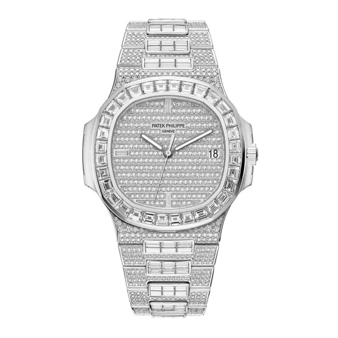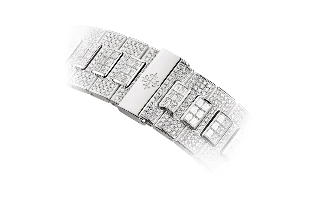 The white gold bracelet, fully paved with diamonds, flows seamlessly into the iconic Nautilus fold-over clasp. Its ergonomic design ensures comfort while exuding unmatched grandeur, making this watch a true statement piece.