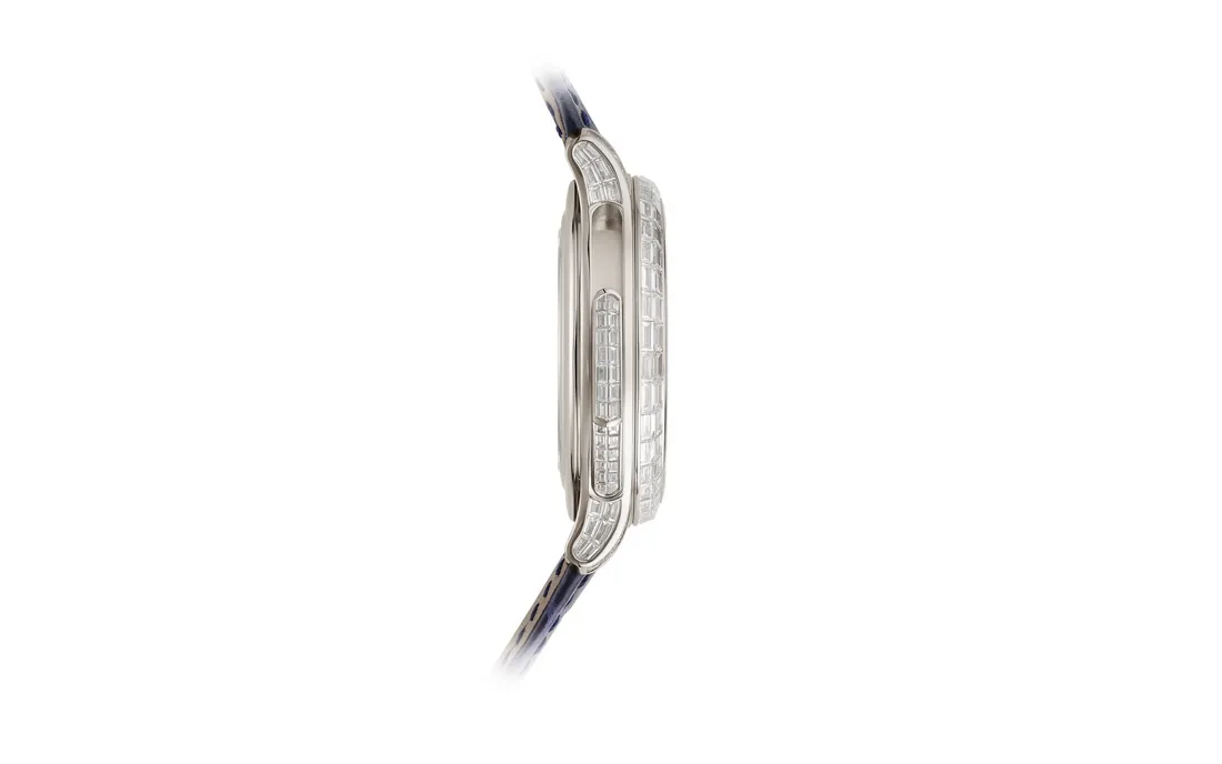 The gemsetting elevates the Patek Philippe Grand Complication 5374/300P-001 Platinum to a new echelon of luxury. Adorned with 228 baguette-cut diamonds totaling 11.62 carats and 13 baguette-cut sapphires totaling 0.72 carats, the watch sparkles with unparalleled brilliance. The gem distribution includes 120 diamonds (7.1 cts) on the bezel and flange, 13 sapphires (0.72 ct) on the flange, 86 diamonds (3.5 cts) on the caseband and slide, and 22 diamonds (1.02 cts) on the clasp. Each gem is meticulously selected for clarity and brilliance, creating a dazzling interplay of light.