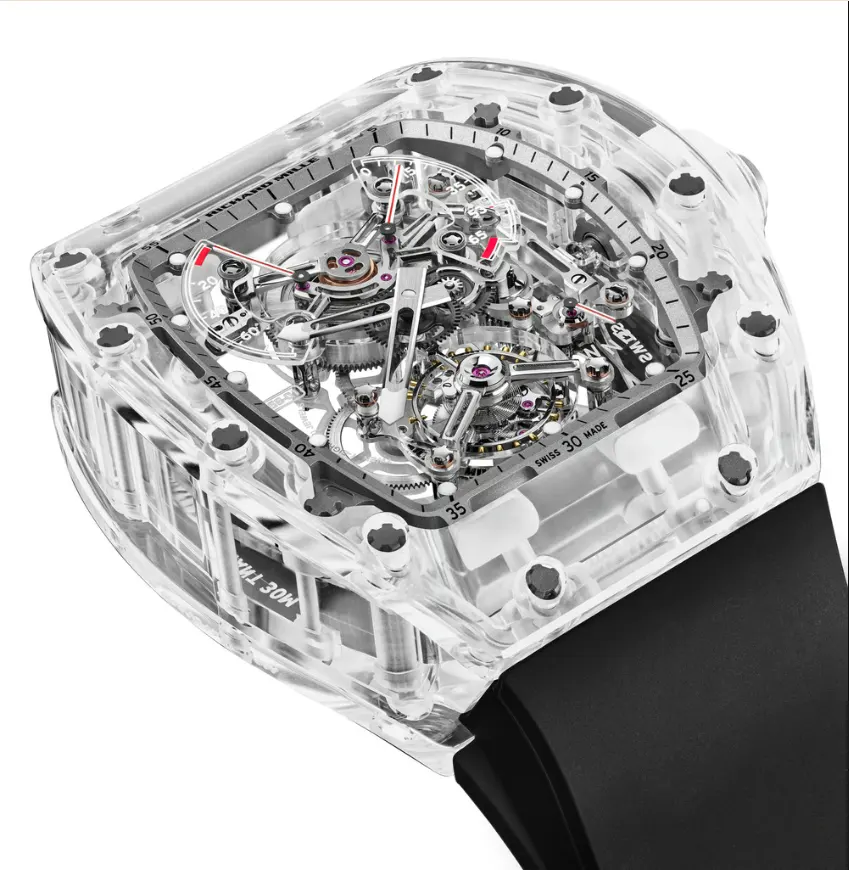 At the core of its design philosophy is Richard Mille’s commitment to creating “racing machines on the wrist.” Every component, from the fully transparent sapphire case to the suspended manual-winding movement, reflects a dedication to precision, durability, and aesthetic audacity. The three-piece sapphire case—including bezel, caseband, and caseback—is machined and polished with extreme precision, allowing light to penetrate the movement from every angle, revealing the intricate interplay of gears, bridges, and wheels in stunning clarity.