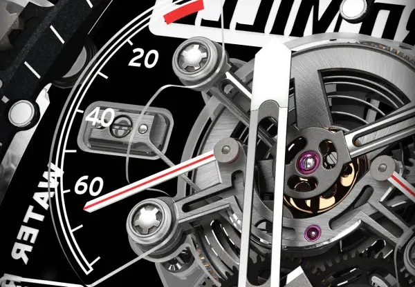 The skeletonized dial is thoughtfully arranged for both aesthetics and functionality. The hours and minutes are displayed at 11 o’clock, providing immediate readability, while the torque indicator at 2 o’clock informs the wearer of the mainspring’s tension, a subtle yet crucial tool for maintaining optimal performance. The function selector at 4 o’clock allows for intuitive operation, letting the wearer seamlessly switch between winding, setting, and neutral modes. This careful layout demonstrates Richard Mille’s commitment to marrying technical sophistication with user-friendly ergonomics.