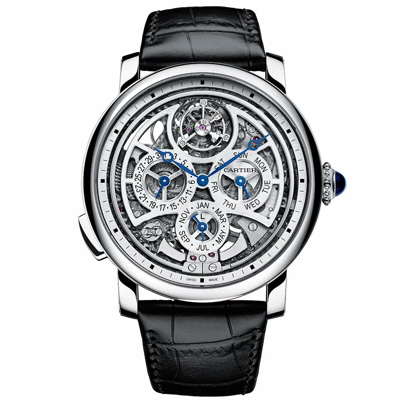 Every element of the Rotonde de Cartier Grande Complication exemplifies meticulous artistry. The skeletonized bridges feature architectural symmetry, and each component is hand-finished, polished, and beveled.