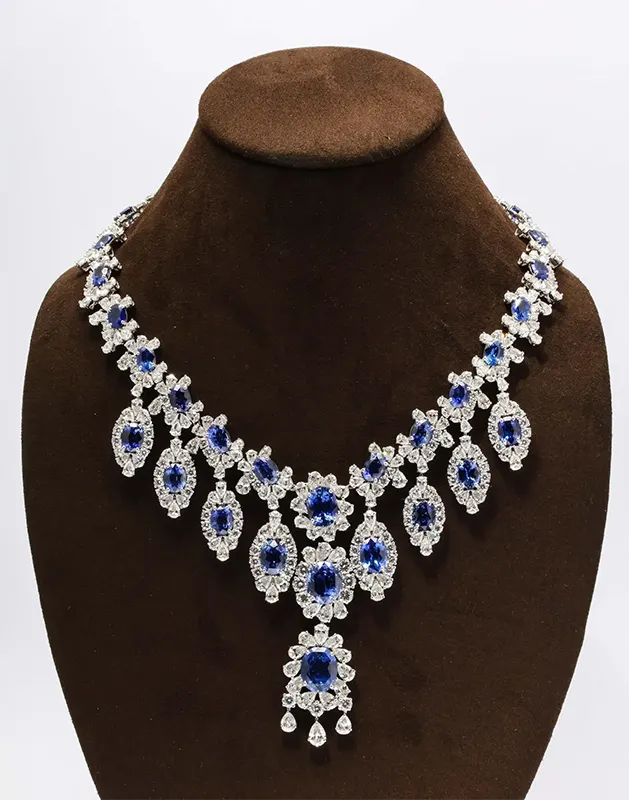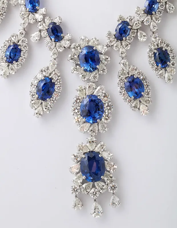 The necklace incorporates 32 pear-shaped sapphires, each surrounded by a halo of round and marquise diamonds. This arrangement creates a floral motif that enhances the sapphires’ vibrancy while adding depth and dimension. The interplay of gemstone shapes ensures that the necklace reflects light beautifully from every angle, capturing attention in any setting. “Browse our stunning range of diamond necklaces, featuring unique designs and exceptional brilliance. View the complete collection here