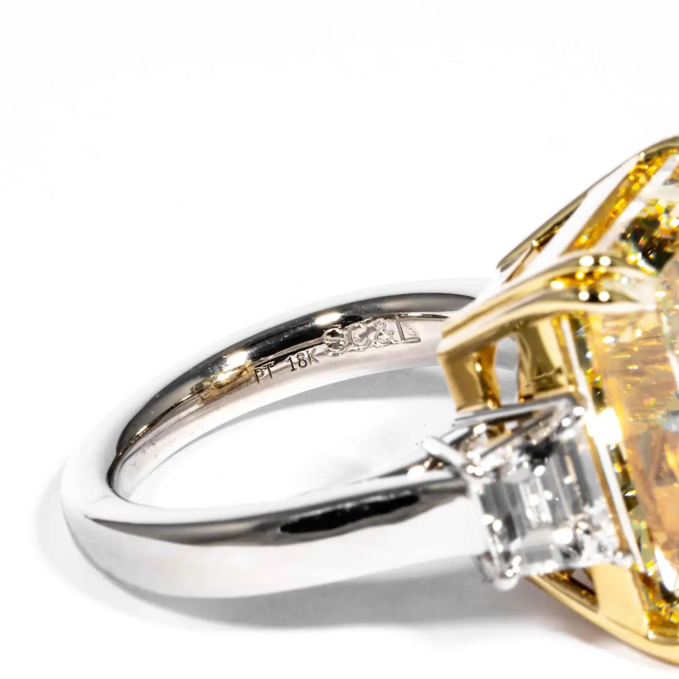 This remarkable ring is meticulously handcrafted in a combination of Platinum and 18K yellow gold, stamped with the hallmark SCL PT 18K on the inside shank.