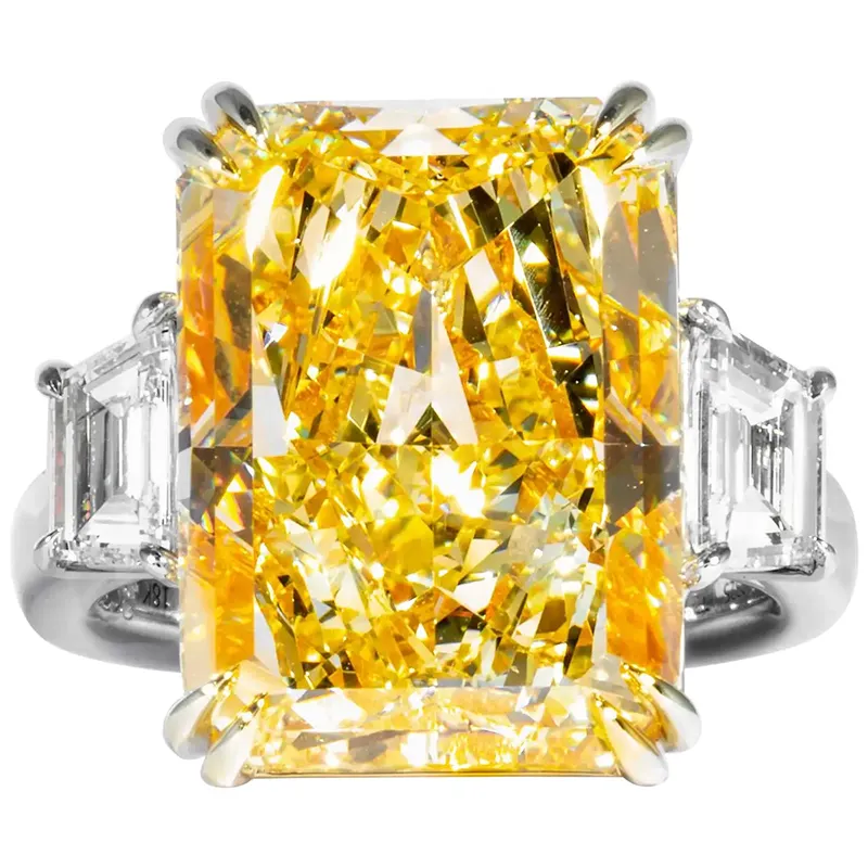 The Shreve Crump & Low GIA Certified 17.01 Carat Fancy Yellow Radiant Diamond Ring custom three-stone setting is expertly crafted to highlight the brilliance and geometry of each stone, creating a harmonious and visually striking composition.