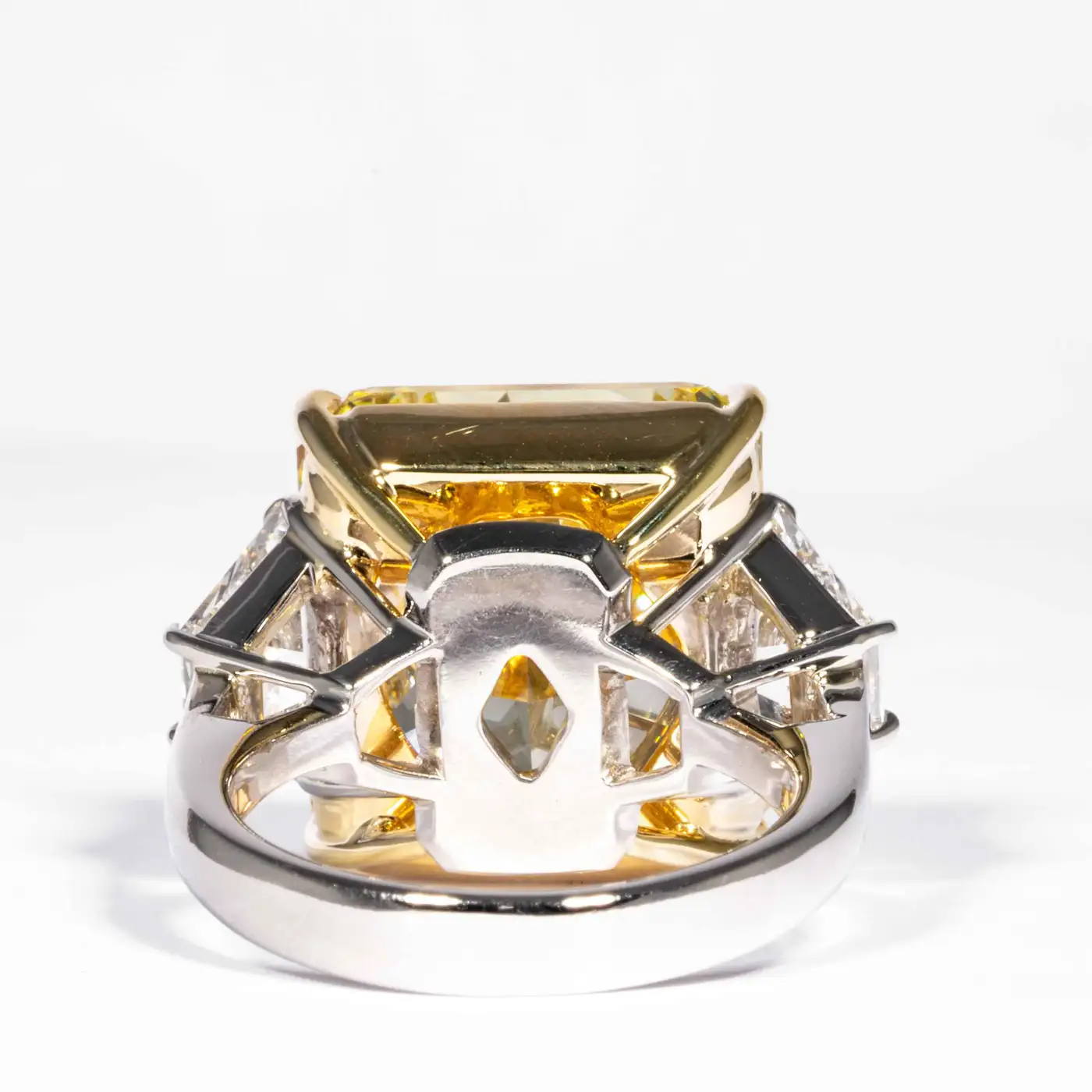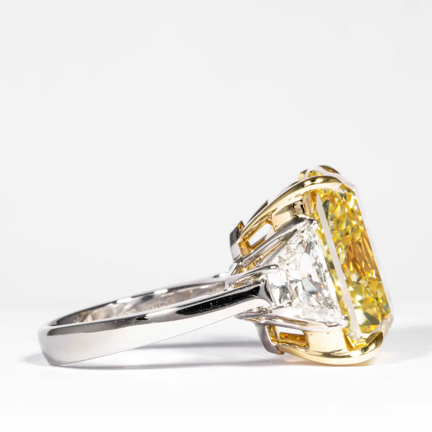Every Shreve Crump & Low GIA Certified 20.24 Carat Fancy Intense Yellow Diamond Ring is meticulously handcrafted by master jewelers. The three-stone setting is created using platinum and 18k yellow gold, offering both durability and a luxurious finish. Each diamond is securely set while showcasing its natural brilliance and fire.