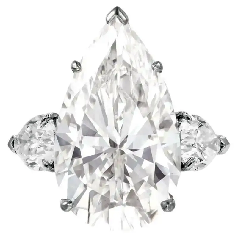 With its remarkable pear cut center stone, D color VVS clarity, and platinum setting with complementary side diamonds, this ring exemplifies the pinnacle of contemporary high jewelry and sophisticated elegance.