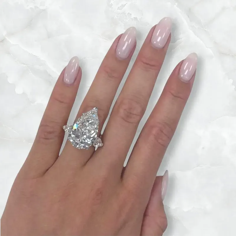 The side pear cut diamonds, also graded D color and VVS clarity, complement the central stone perfectly, enhancing its visual impact and creating a harmonious, sophisticated aesthetic.