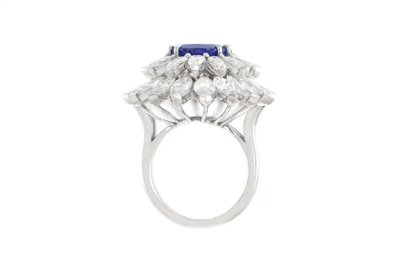 The platinum setting showcases masterful handwork with an architectural arrangement of marquise and pear-shaped diamonds surrounding the central sapphire.