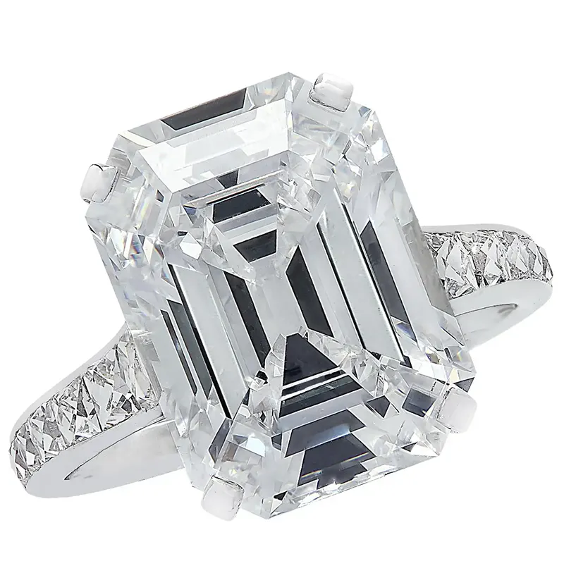 The ring’s platinum setting and meticulously arranged round brilliant-cut accent diamonds enhance the central stone’s natural fire and brilliance, highlighting the skill and artistry of the master jewelers who crafted it. Its harmonious design balances antique sophistication with contemporary elegance, ensuring that the Vivid Diamonds GIA Certified 7.23 Carat Emerald Cut Diamond Engagement Ring is as visually striking as it is historically significant.